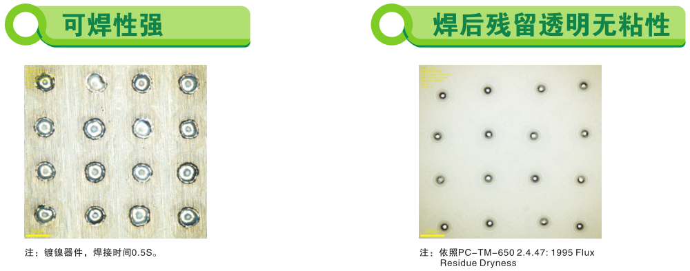 本產(chǎn)品活性劑具有快速釋和優(yōu)良潤濕的特點(diǎn)。在快速加熱焊接工藝應(yīng)用過程中,可在1S內(nèi)完成焊接,對(duì)焊接面潤濕性好,不炸錫,不飛濺,焊后殘留少無粘性,無腐蝕。殘留阻抗高,焊接完成后焊點(diǎn)、殘留表面絕緣阻抗(SIR)和電遷移(ECM)滿足IPC相關(guān)標(biāo)準(zhǔn)。焊劑類型分級(jí)屬ROL0級(jí)。